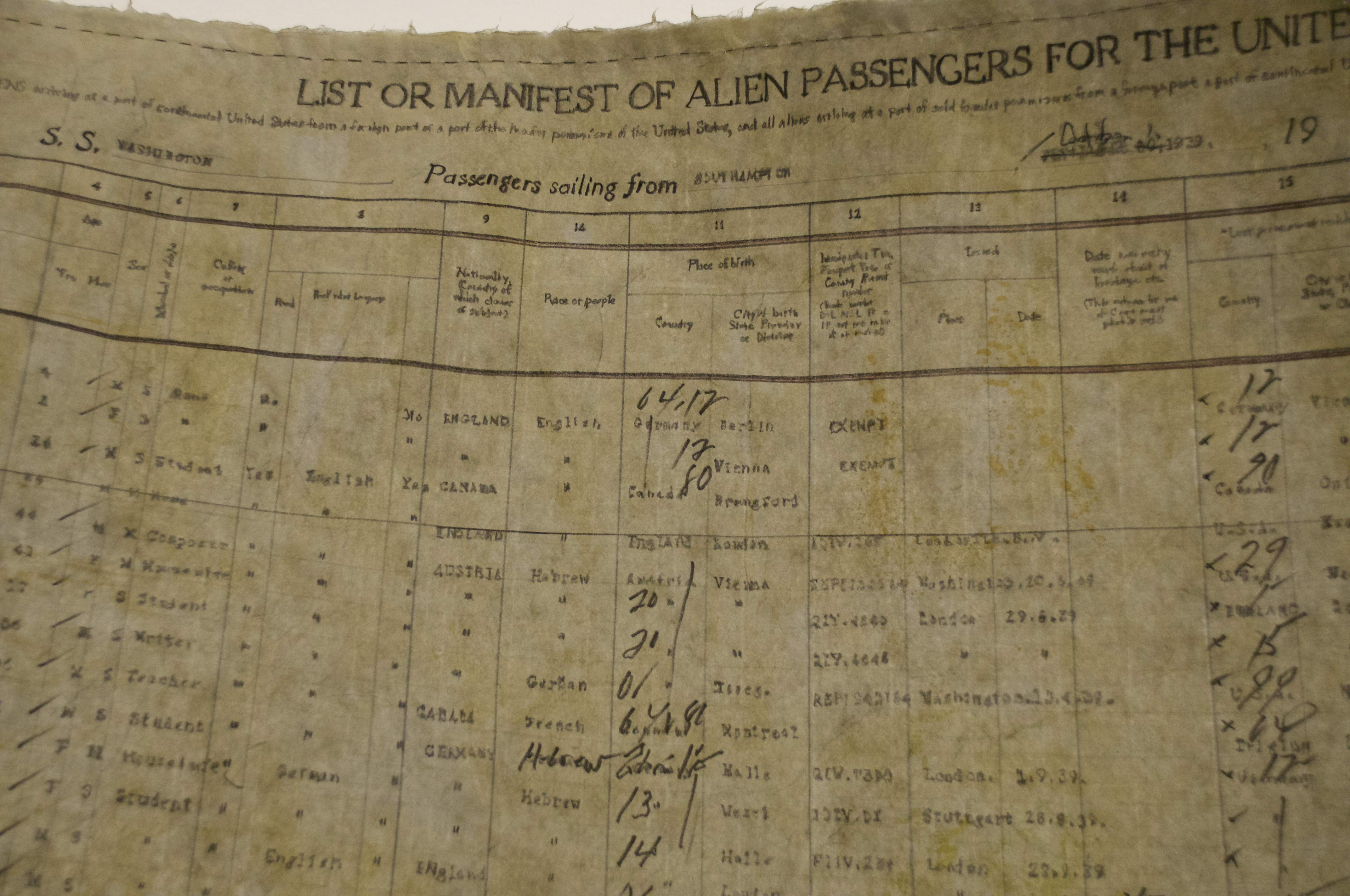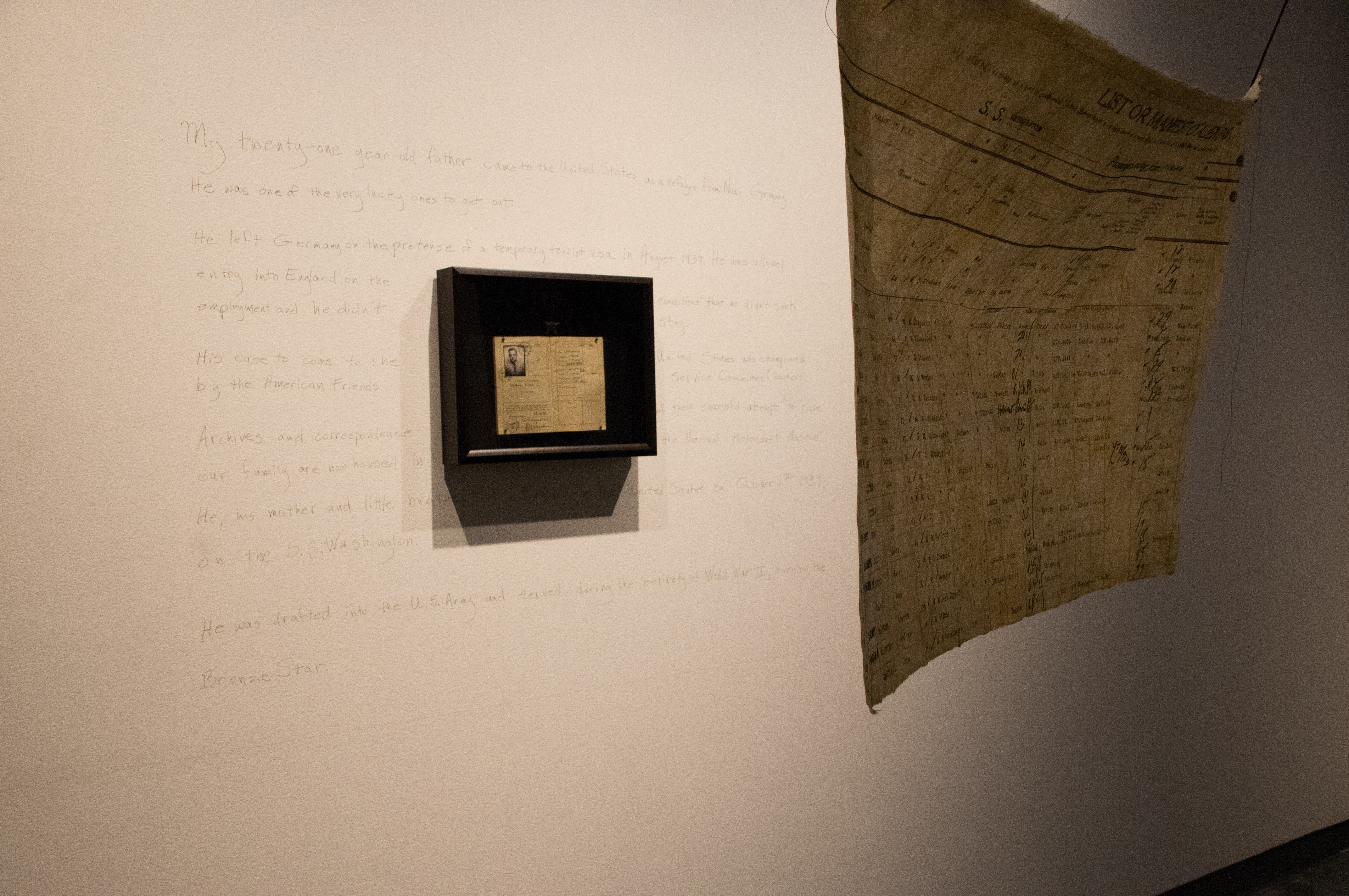 It consists of handwritten narration on the wall of my father’s escape from Germany in 1939 and a bit of what happened to him; a shadow box containing his original Nazi passport and the Bronze Star he earned during World War II. Hanging from the ceiling and wafting in the air flow is a drawing of the ship’s manifest from the U.S.S. Washington dated October 1, 1939, on which my father, grandmother and uncle came to the U.S.