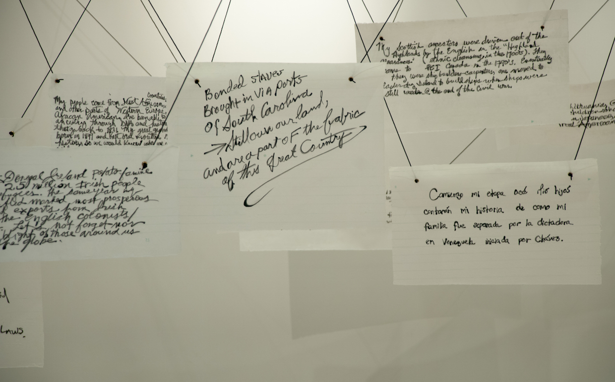 The Owing to Circumstances Project is an ongoing dialog among audience members, artists, children and parents and organizations. The core of Owing to Circumstances is a series of interactive installations in which audience members write about how and why their families, or their communities, came to be in the United States. Those stories are then reproduced in the original handwriting and honored by hanging the drawings in a series of installations, and projections. They form the basis of a dialog among the various participant communities. A visitor to one installation could see their own story represented and engage in an ongoing web dialog about why they and their families are here in the U.S. Each installation may evolve and be unique to the participants involved.