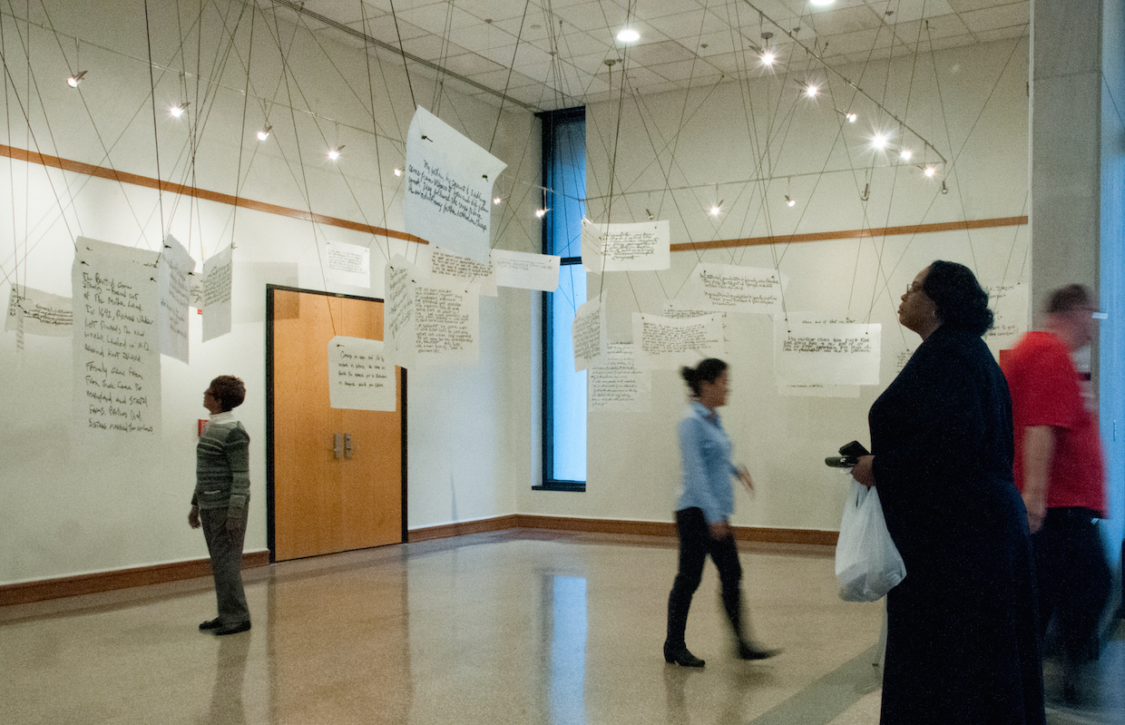 This installation of The Owing to Circumstances Project was in 2017 at the Mezzanine Gallery of the Delaware State Building in downtown Wilmington.