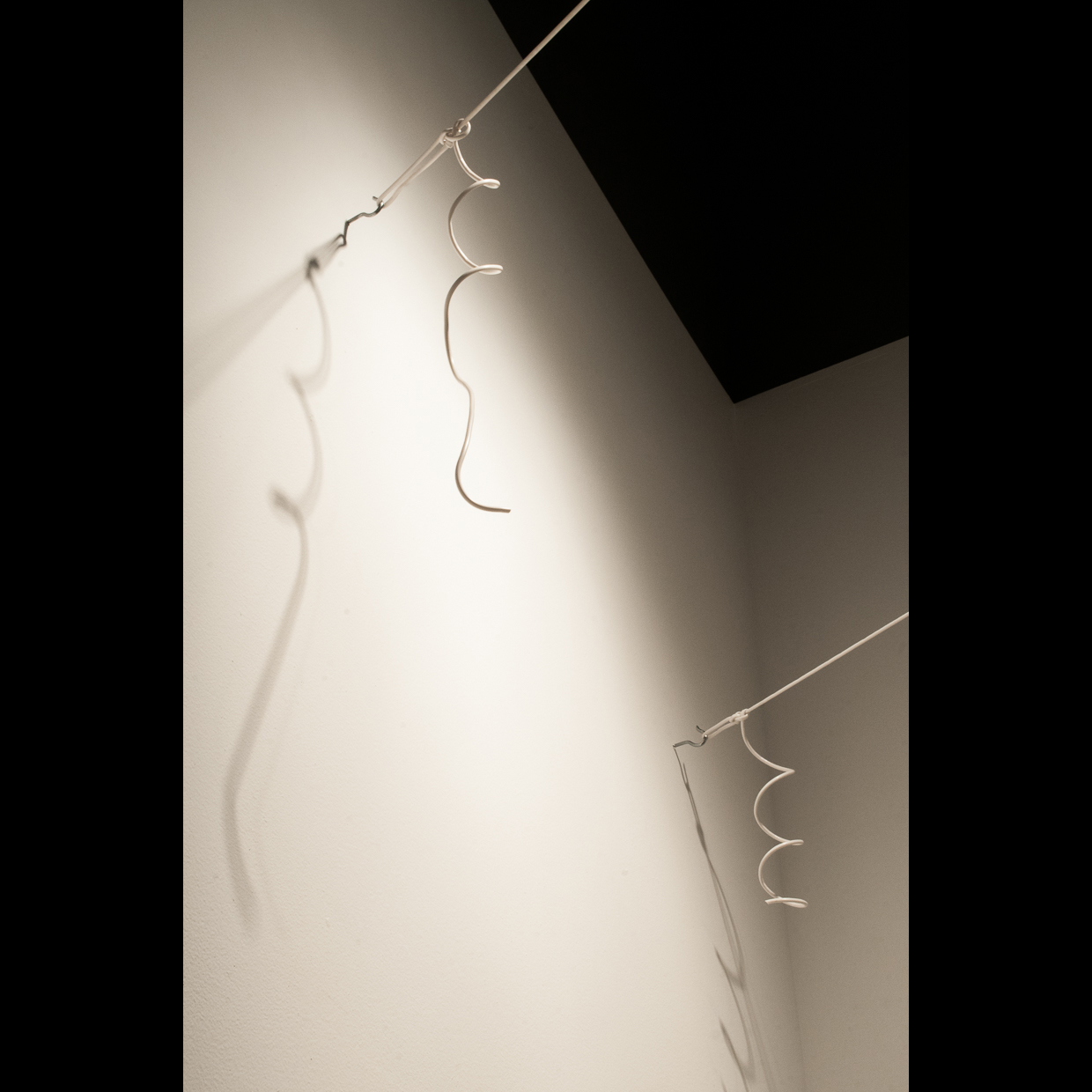 Untitled (Laundry Line), 2015, is comprised of two cords strung with large plastic sheeting panels on which “doodles” are drawn over their surfaces. The panels move slightly with the airflow and movement of viewers. This refers to my life at the time especially— life with small children, life doing laundry, the beauty, delicacy and tediousness of it.
