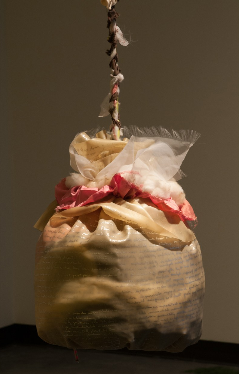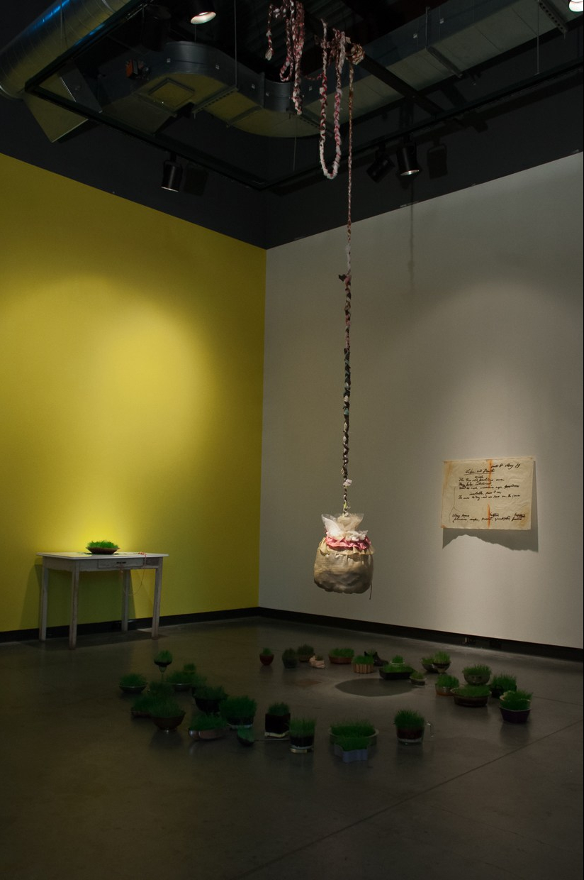 Up and Down consists of ordinary materials of domestic life— cooking pots, bowls and containers, a kitchen table, growing lawn grass, fabrics and braiding— bundled together in this installation. Often things are messy: lint and grass clippings on the floor, the central piece, Bindle, contains wads of fabric scraps and is hung pendulum-like.