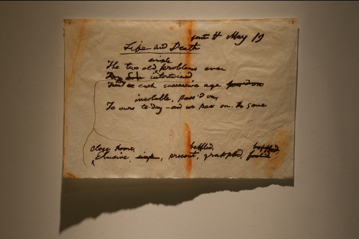 There is questioning: the quiet billowing of a Walt Whitman poem, Life and Death, drawn from a manuscript from his own hand, with all of its original cross-outs and edits; the writings on the rubber sheath of Bindle is a series of synonyms for doubt. The somber lighting of the show mixes together with the smell of clipped grass, growth, life and quotidian pleasures.